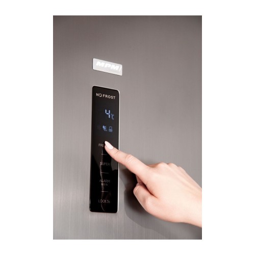 Електронне управління холодильником здійснюється через незамінну сенсорну панель, що інтуїтивно зрозуміла та проста у використанні. Вона дозволяє легко налаштовувати режими роботи, включно з автоматичними функціями Super (швидке охолодження) та Eco (енергозбереження), а також режим Holiday для підтримання постійної температури під час від'їзду.