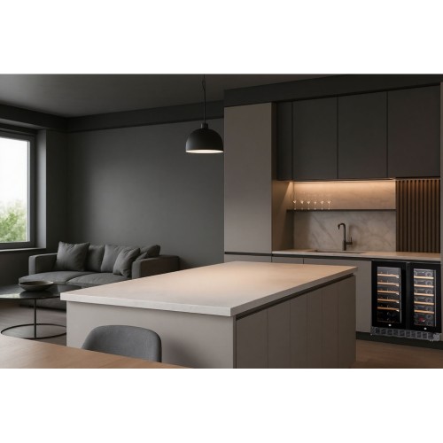Конструкція холодильника передбачає використання дерев'яних полиць, що не лише створює естетично приємний вигляд, але й гарантує оптимальну підтримку пляшок. Приємна підсвітка за допомогою LED-освітлення додає стилю та елегантності, надаючи вам змогу вибрати улюблене вино навіть у темряві.