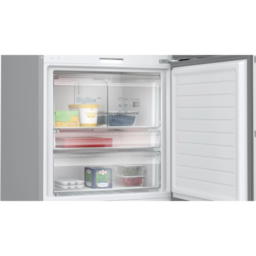 Холодильна камера обладнана трьома міцними полицями з загартованого скла, шістьма місткими дверними корзинами та практичним контейнером для овочів. Естетично виготовлені елементи дозволяють ефективно організувати простір і забезпечують легкий доступ до всіх продуктів. Особлива увага приділена зонам hyperFresh, котрі мають окремі ящики для м'яса та риби, де підтримується оптимальна температура для збереження свіжості.