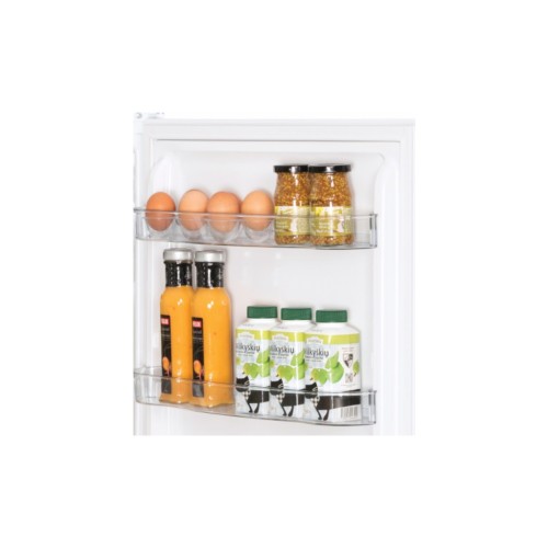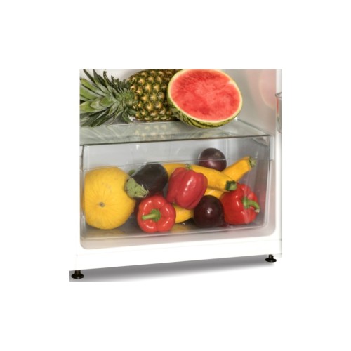 Цей двокамерний холодильник з верхнім розташуванням морозильної камери забезпечує зручність і ефективність у зберіганні продуктів. Із загальним об'ємом 220 літрів, з яких 166 літрів відведено під холодильну камеру, він пропонує вдосталь місця для вашого сімейного запасу. Внутрішні полиці зроблені зі стійкого до навантажень загартованого скла, що витримує до 25 кг, дозволяючи вам безпечно зберігати важкі посудини та великі продукти.