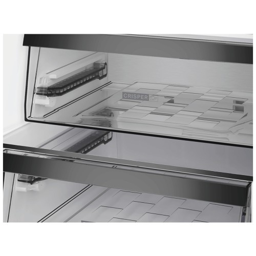 Зручне електронне керування доповнене внутрішнім дисплеєм, який дозволяє контролювати температуру та активувати режими, серед яких швидке замороження, режим «Відпустка» для енергоощадності, сигналізація відчинених дверцят і функція перевішування дверей. Усередині передбачено LED-освітлення, що рівномірно висвітлює камери та створює комфорт під час користування.