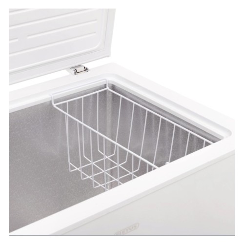 У металевому кошику зручно зберігати невеликі упаковки, щоб не марнувати час на пошуки потрібних продуктів. Його можна переміщувати або повністю зняти, щоб максимально використовувати внутрішній об’єм скрині – зберігати готові страви, заготовлювати ягоди і зелень, заморожувати великі шматки м’яса, птиці та риби.