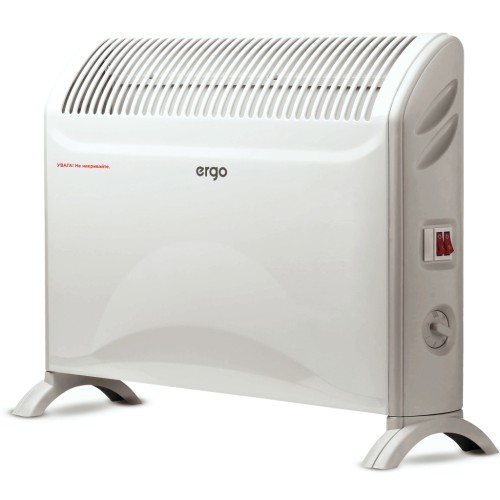 Обігрівач ERGO HC 2020 випускається у сучасному дизайні у корпусі білого кольору. Він монтується або стаціонарно на стіну за допомогою кронштейнів або на колісні платформи, щоб вільно переміщатися в потрібне місце. Всі деталі кріплення для обох варіантів установки входять в комплект поставки. Модель обладнана цільнолитим Х-подібним нагрівальним елементом потужністю 2 кВт, виготовленим із алюмінію. Вона призначена для використання в приміщеннях площею до 20 кв.м і працює у двох режимах: повної та половинної потужності. Конструкція приладу забезпечує швидке та ефективне нагрівання, а точне регулювання бажаної температури проводиться механічним термостатом. Керується обігрівач ERGO HC 2020 двома ергономічними поворотними перемикачами з індикатором увімкнення, розташованими на бічній панелі. Апарат виконаний у пило- та бризкозахисному виконанні класу IP X4 та оснащений системою захисту від перегріву.