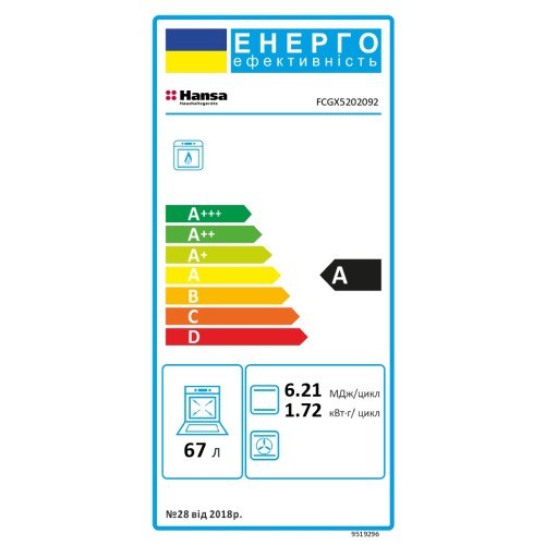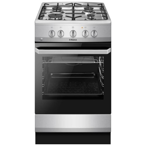 Газова плита Hansa FCGX5202092 з нержавіючої сталі оснащена 4 конфорками з газовим контролем і електрозапалюванням у ручках. Духовка об’ємом 67 л має підсвітку та стандартні напрямні, у комплекті стільникове деко.