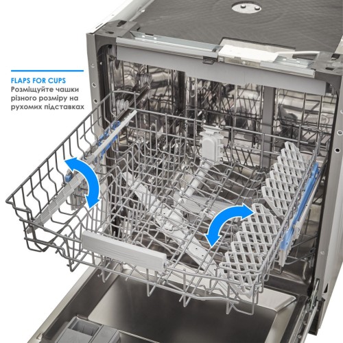 Почали завантажувати верхній кошик, але не вміщаються склянки? Чи потрібно ще 5 см, щоб помістити найбільшу каструлю в нижньому кошику? Спеціальний механізм FlexiLift дозволяє переналаштувати внутрішній простір, не виймаючи кошик з машини. Просто підійміть чи опустіть верхню полицю навіть, якщо вона заповнена.
