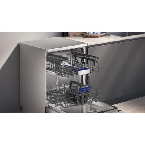 Модель підтримує Home Connect, що дозволяє керувати посудомийною машиною зі смартфона, отримувати сповіщення та контролювати процес миття дистанційно. Внутрішня камера з блакитним підсвічуванням створює приємну атмосферу та полегшує завантаження посуду. Передбачені зручні кошики з можливістю регулювання верхнього короба за висотою та спеціальна зона для делікатного миття келихів.