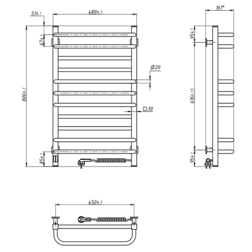 Електрична сушка для рушників NAVIN Грандіс - яскравий зразок мінімалізму. Модель має бічні колектори (стійки), виготовлені з профільної квадратної труби 30х30 мм, а перемички з круглих трубок 20х20 мм. Це створює просту, строгу та нескінченно привабливу геометричну гармонію.