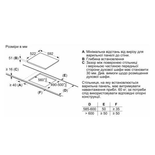 Комфортні розміри (59.2 х 52.2 х 5.1 см) та розміри ніші для вбудовування (56 х 49-50 х 5.1 см) дозволяють без проблем інтегрувати варильну поверхню в будь-який кухонний простір.