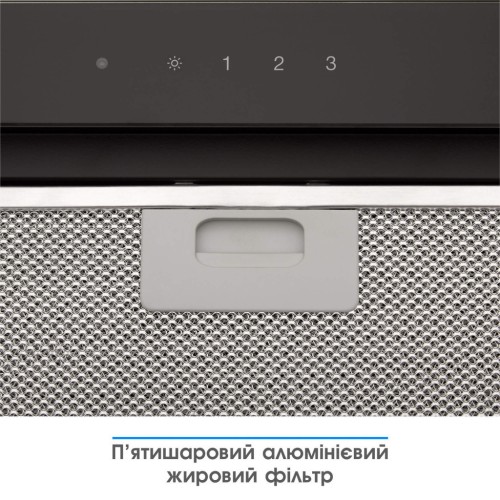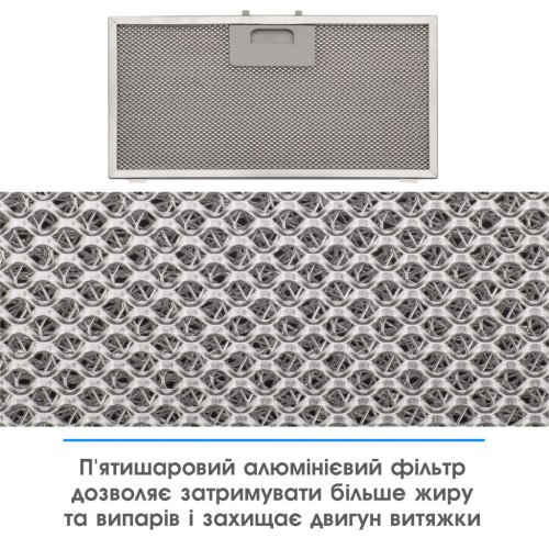 Міцний 5-шаровий алюмінієвий фільтр поглинає жир, бруд, дрібні сторонні частинки та захищає двигун капота. Для зручності очищення досить зняти його і помити в гарячій воді або посудомийній машині.