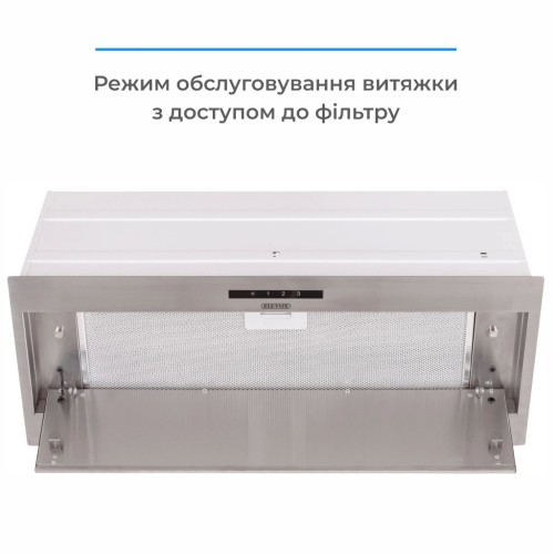 Витяжка монтується безпосередньо в кухонну шафу шириною 60 см, не займаючи додаткового місця на кухні. Видимою залишається частина, виготовлена з нержавіючої сталі. Завдяки чому вона ідеально підходить до будь-якого інтер’єру, залишаючи вашу кухню вільною та організованою.