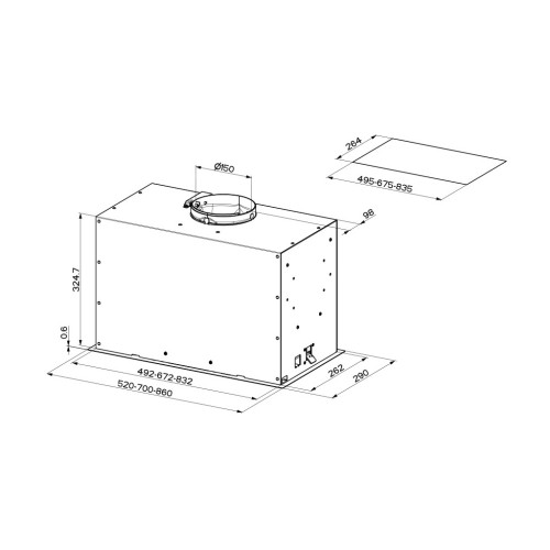 Повновбудована витяжка, відведення/рециркуляція повітря, макс. продуктивність 620 м3/год, електронне керування, 3 швидкості, LED освітлення, алюмінієвий фільтр, ширина 70 см, колір чорний