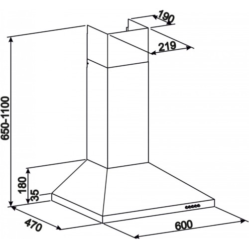 Камінна пристінна витяжка, режим роботи відведення, продуктивність 650 куб.м/год, 3 швидкості, кнопкове управління, світлодіодна лампа, алюмінієвий жировий фільтр, ширина 60 см.